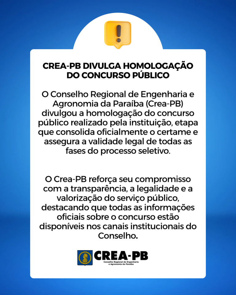 Crea-PB divulga homologação do concurso público no dia 23 de Dezembro