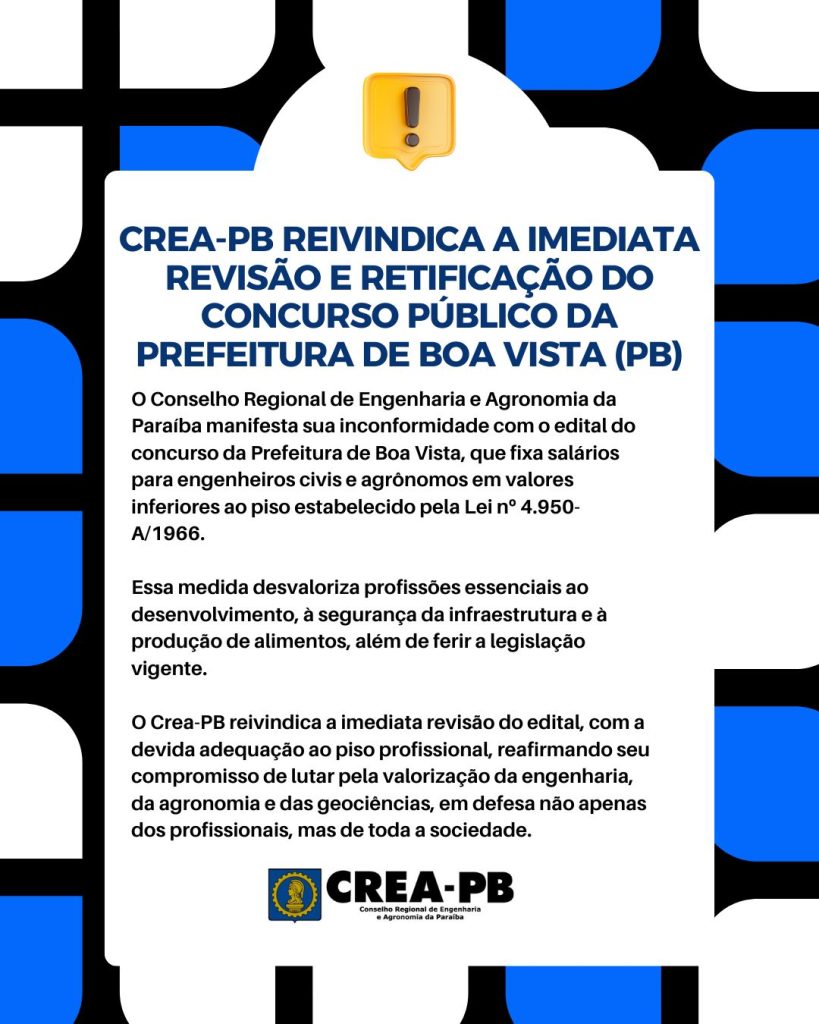 As Prefeituras de Boa Vista e de Brejo do Cruz publicaram editais de concurso público oferecendo salários para engenheiros civis, ambientais e agrônomos em valores inferiores ao piso estabelecido pela Lei nº 4.950-A/1966.